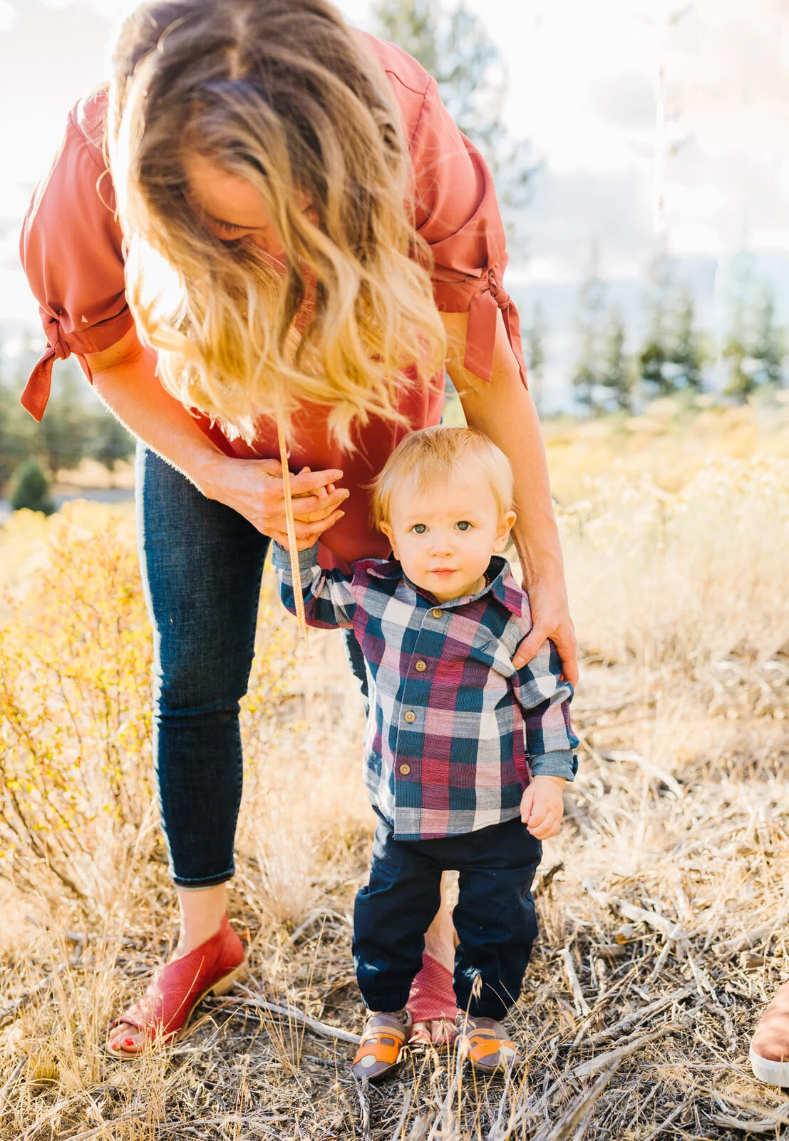 Taking pictures of families as a Bend Photographer is seriously a dream! This is our first real fall in a number of years and I am so excited to experience it again! To wear long pants comfortably, socks, boots!!....but I digress. I love the pine trees and seeing the scenery change and seeing my families fall outfits. It all just makes me so happy. Tis the season for updated family pictures and Christmas card season is just around the corner. I loved the Brown family's fall color scheme that tied in with the feel of Fall at their location. The reds and the plaid are just a match made in heaven. I love the stage that the Brown Family is at with their little guy. Probably because we have boys the same age. The chunky baby-ness but strong independent moving towards the toddler stage. Its so fun.